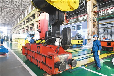 今年以来,哈电集团哈尔滨电机厂有限责任公司加快改革创新,推进生产经营各项工作深入开展,前三季度,该企业完成工业总产值31.15亿元。图为10月30日,在该公司生产车间,工人在进行生产作业。