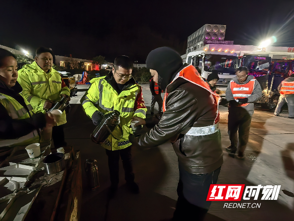 党建引领,凝聚“抗冰合力”。在全力攻坚道路畅通的同时,中心充分激活方舱“服务驿站”功能,将党组织的温暖精准送达群众心坎。党员志愿者与工作人员一道,为滞留司乘人员免费递上驱寒暖身的姜茶、即时充饥的面包,备好应对感冒、冻伤的应急药品,同步发放冰雪天气行车安全指南,用一句句贴心叮嘱、一次次细致服务,缓解司乘人员的焦虑情绪,驱散冬日的严寒。小小的服务驿站里,党旗熠熠生辉,干群同心抗冰的暖流涌动,成为风雪路上最动人的风景。