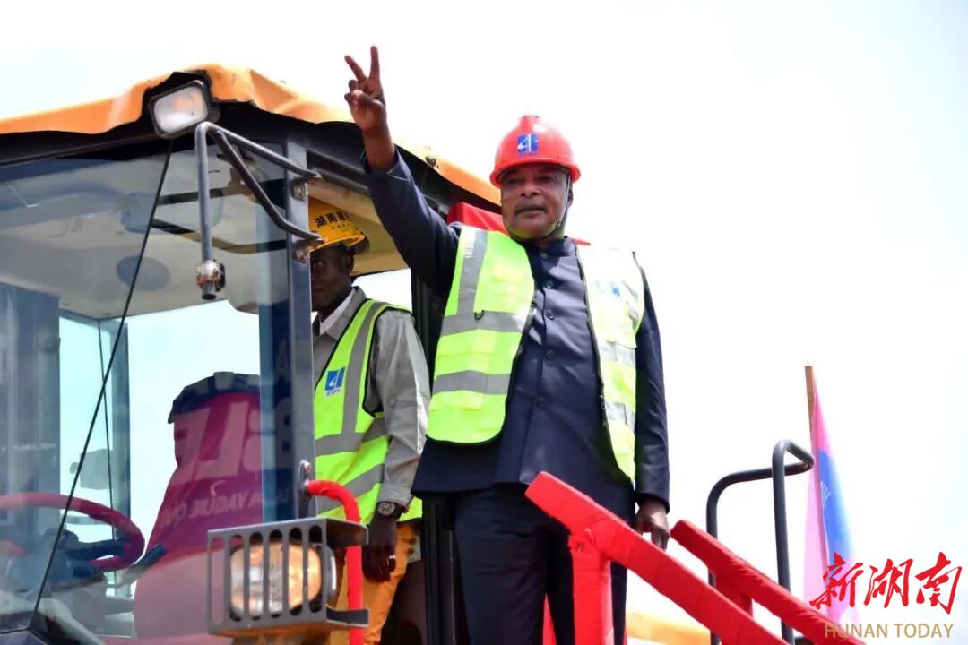 在启动仪式上,萨苏总统在中方人员陪同下亲自操作工程机械,完成奠基环节,标志着这条连接中非地区的国际交通大动脉正式启动建设。