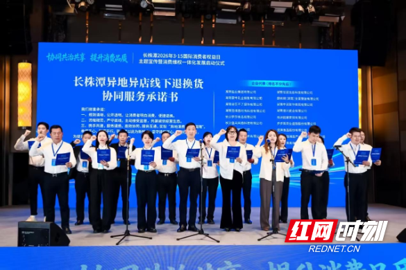 长株潭2026年“3·15”国际消费者权益日主题宣传暨消费维权一体化发展启动仪式在3月10日举行。当长沙、株洲、湘潭三地市场监管部门共同签署《消费维权一体化合作框架协议》时,湖南盐业集团及雪天盐业公司代表与全省重点代表企业负责人一同登台,宣读《长株潭异地异店线下退换货承诺书》。